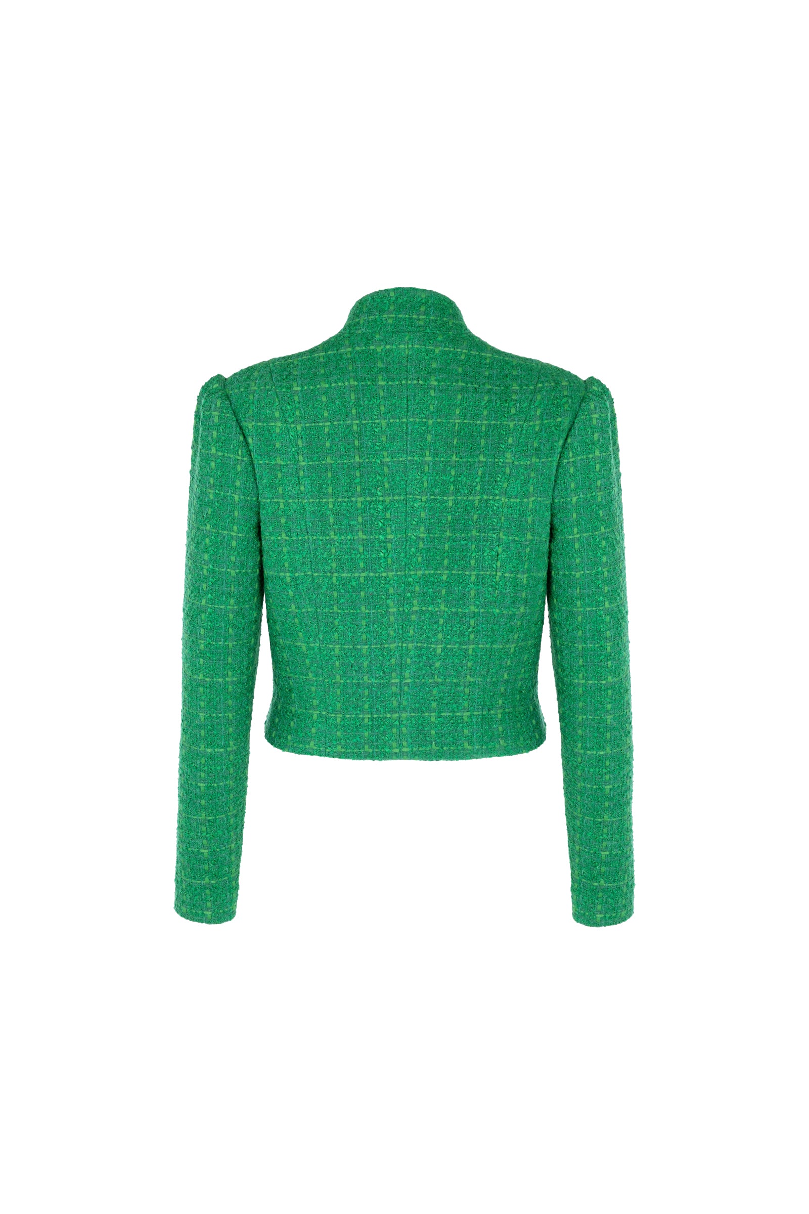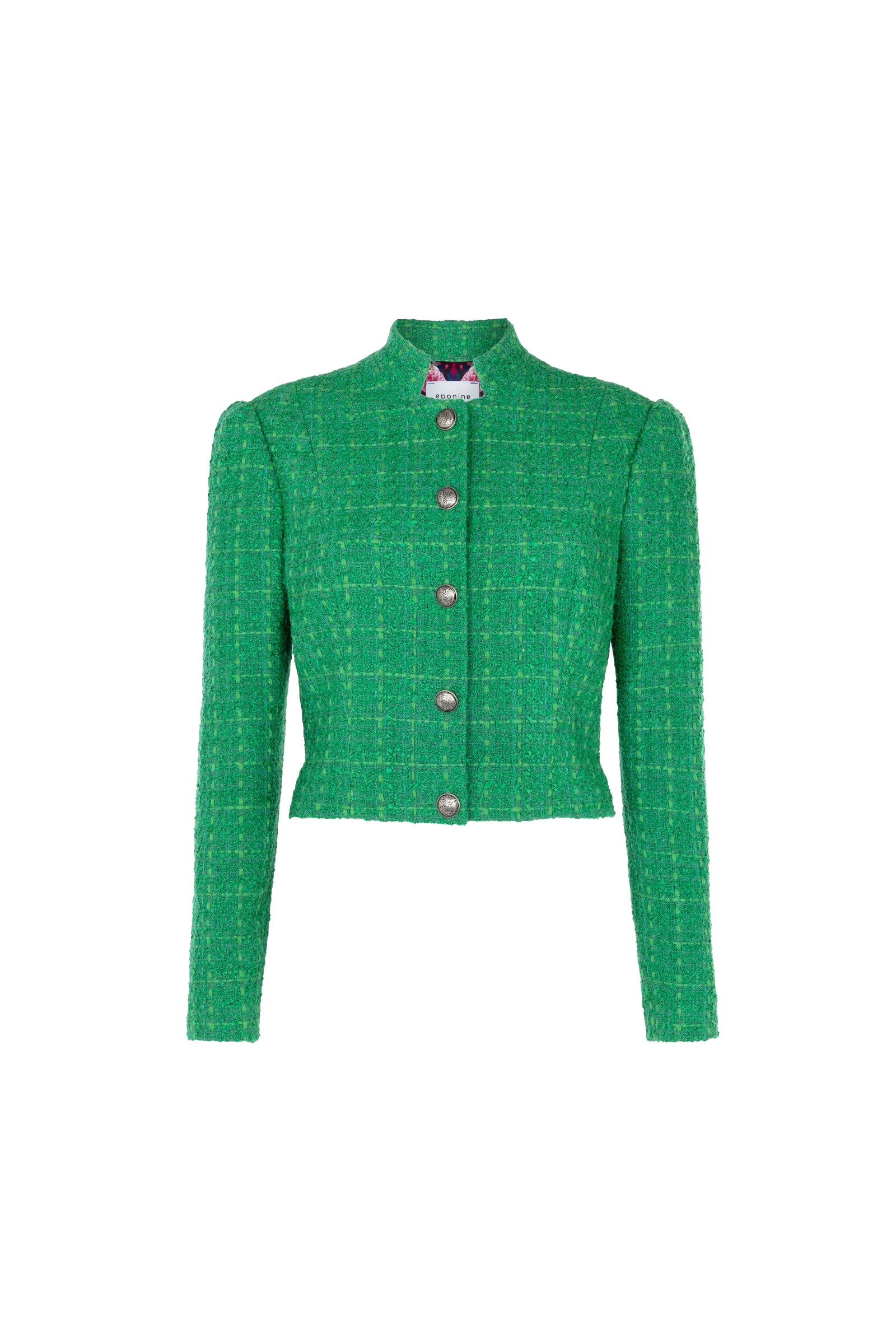 Textured boucle cropped jacket featuring a fitted, elegant cut that softly cinches the waist at its smallest point. A mandarin collar crowns full-length leg-of-mutton sleeves, while silver buttons fasten it together on the centre-front.