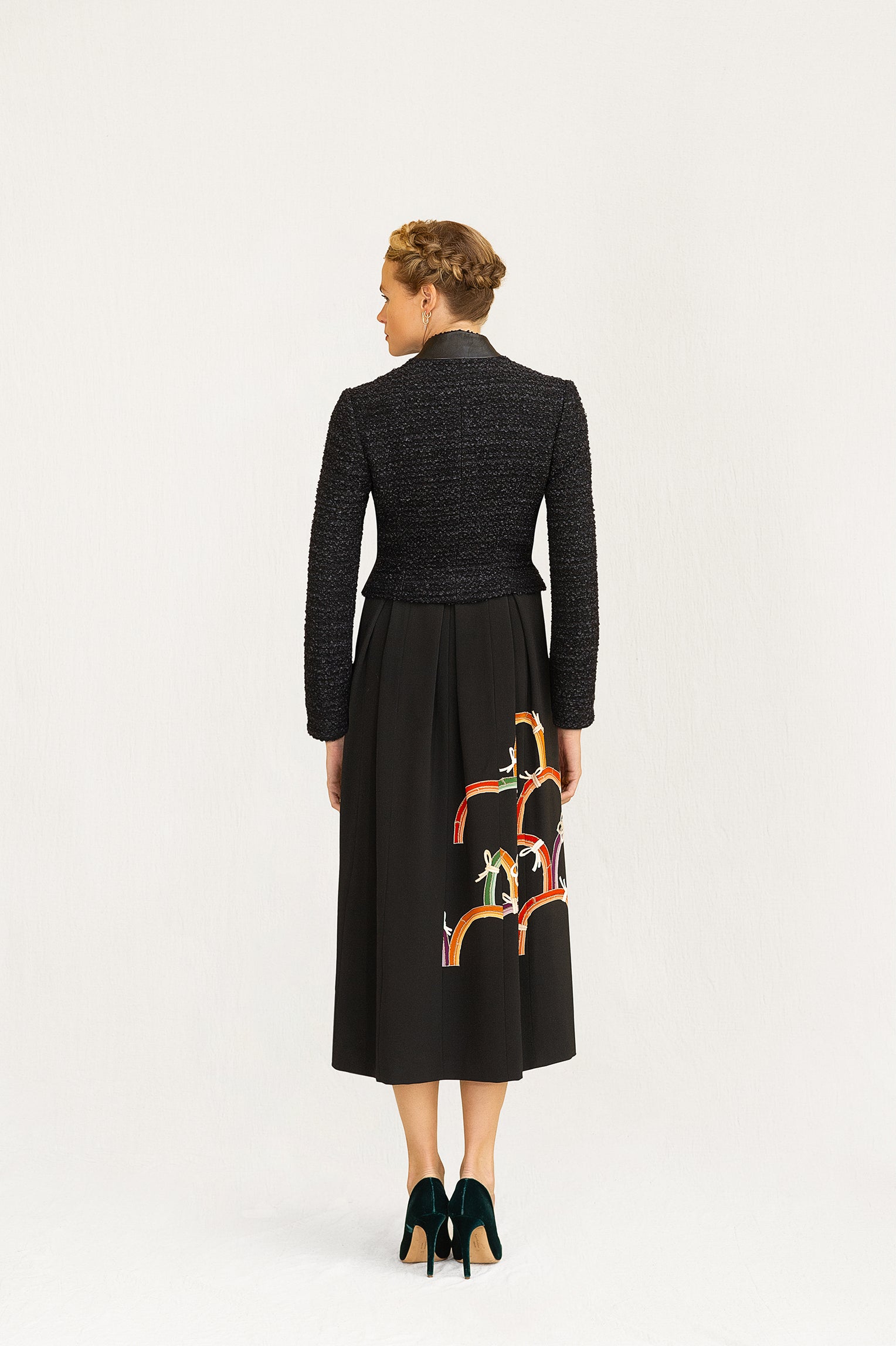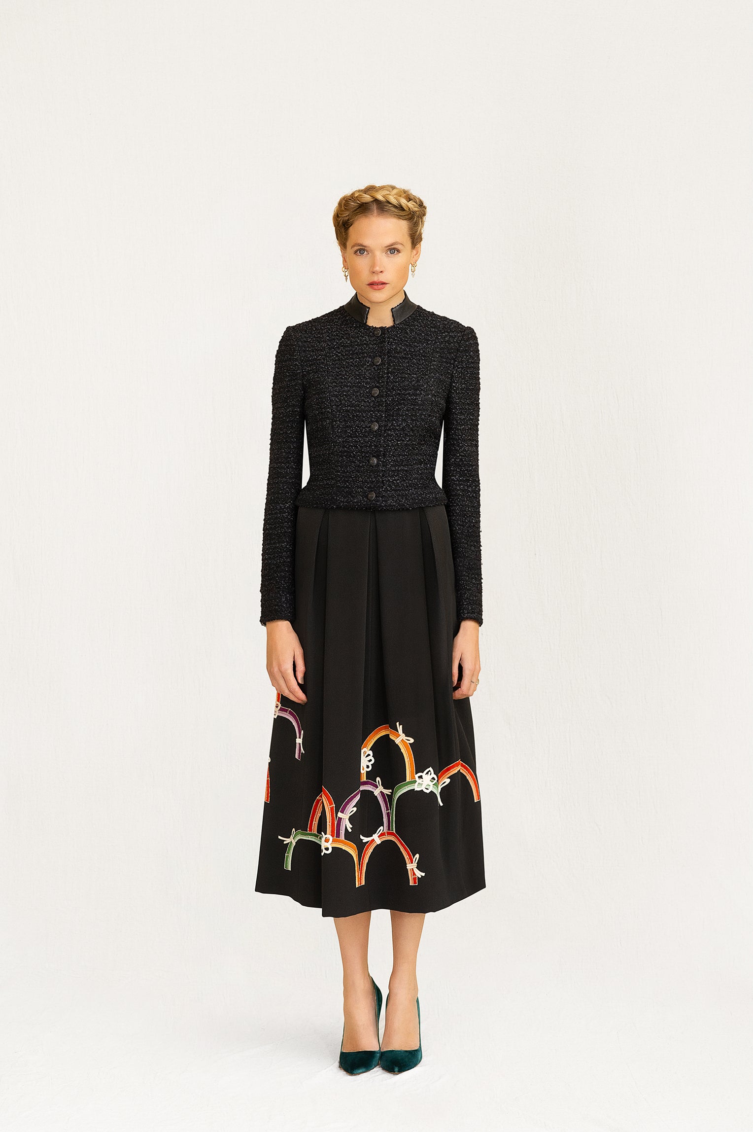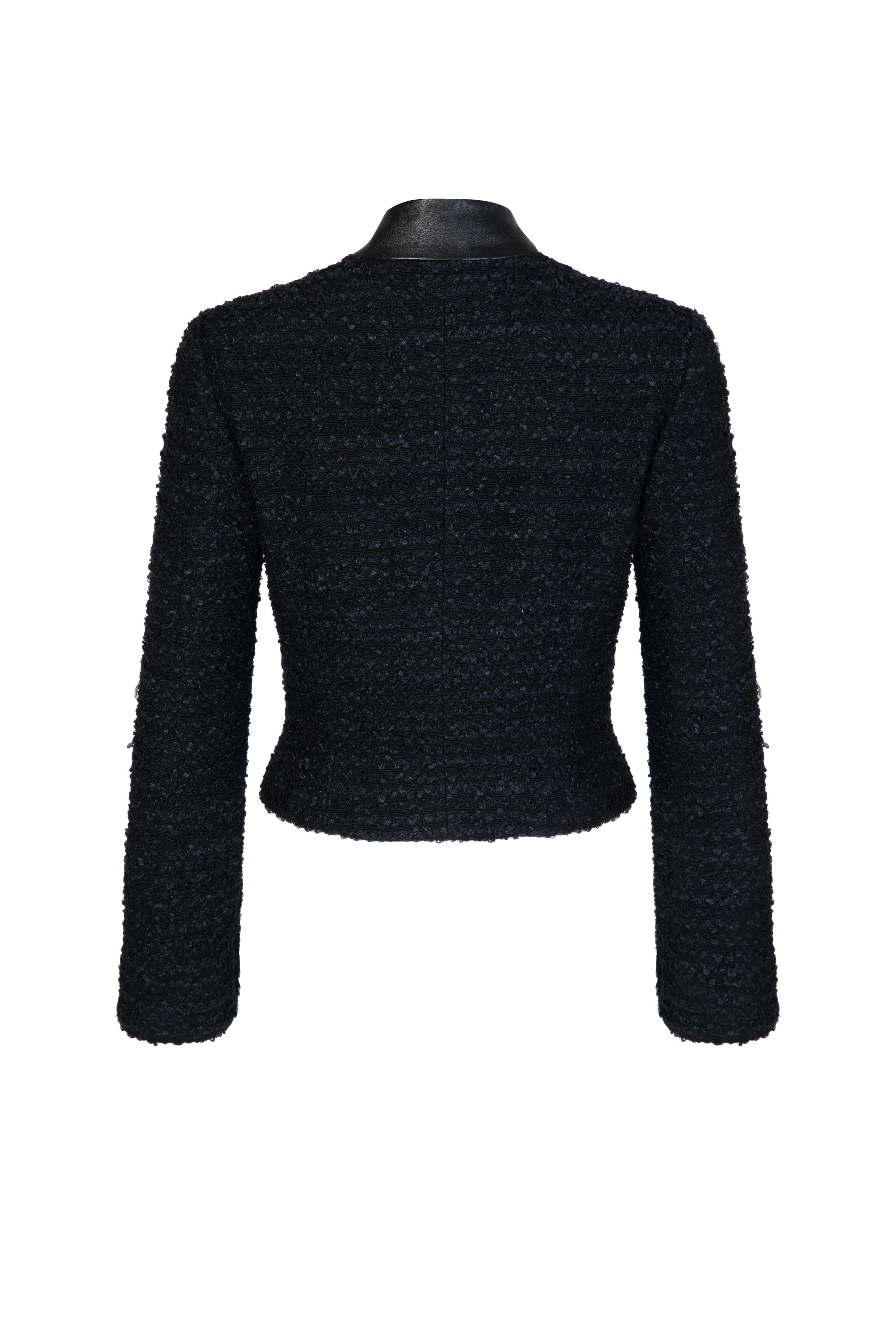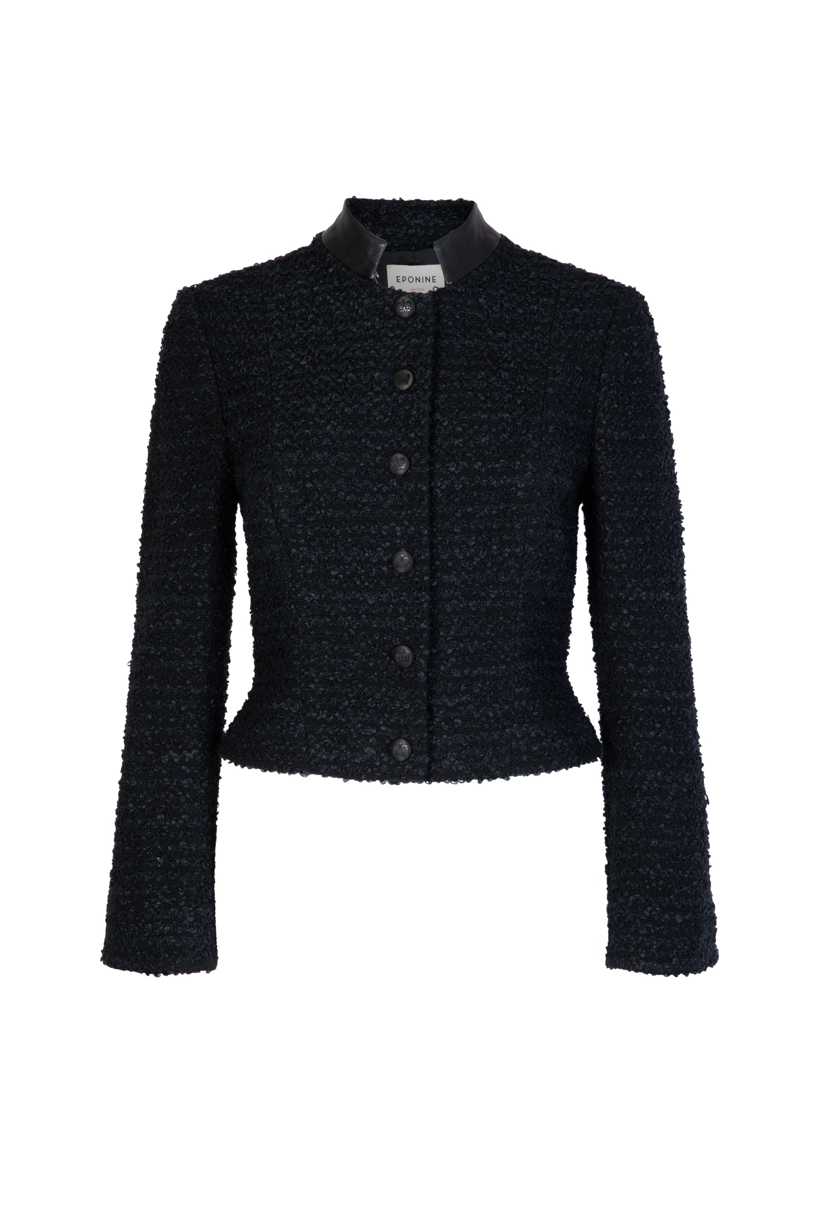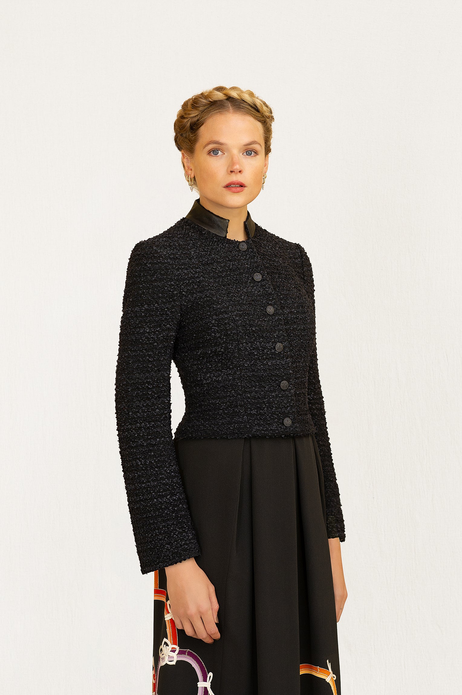 Textured boucle cropped jacket featuring a leather military collar, embossed buttons and fluted full-length sleeves. Exquisite in its versatility, Rafaela transitions seamlessly from day to night. Lined in a bold satin print.