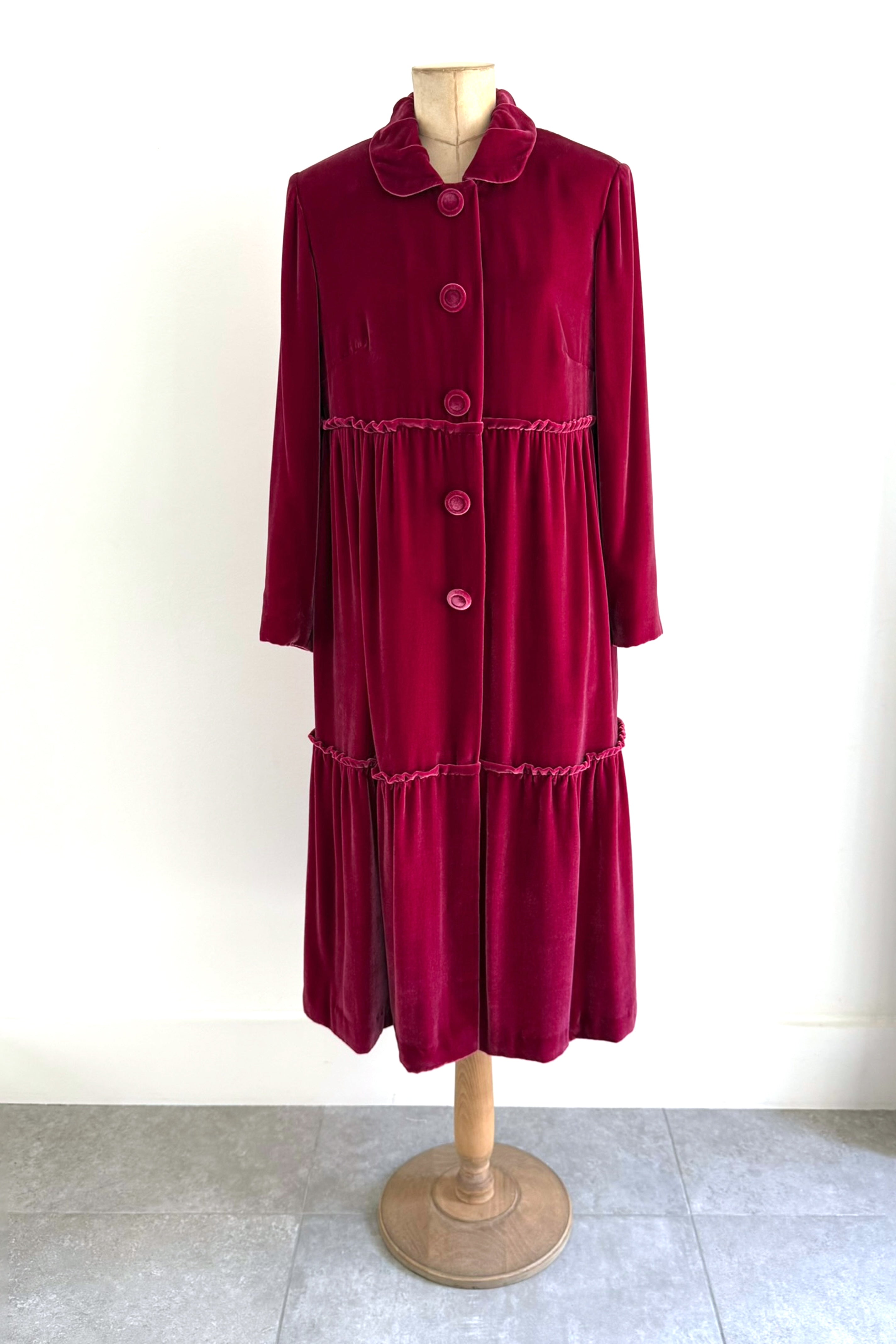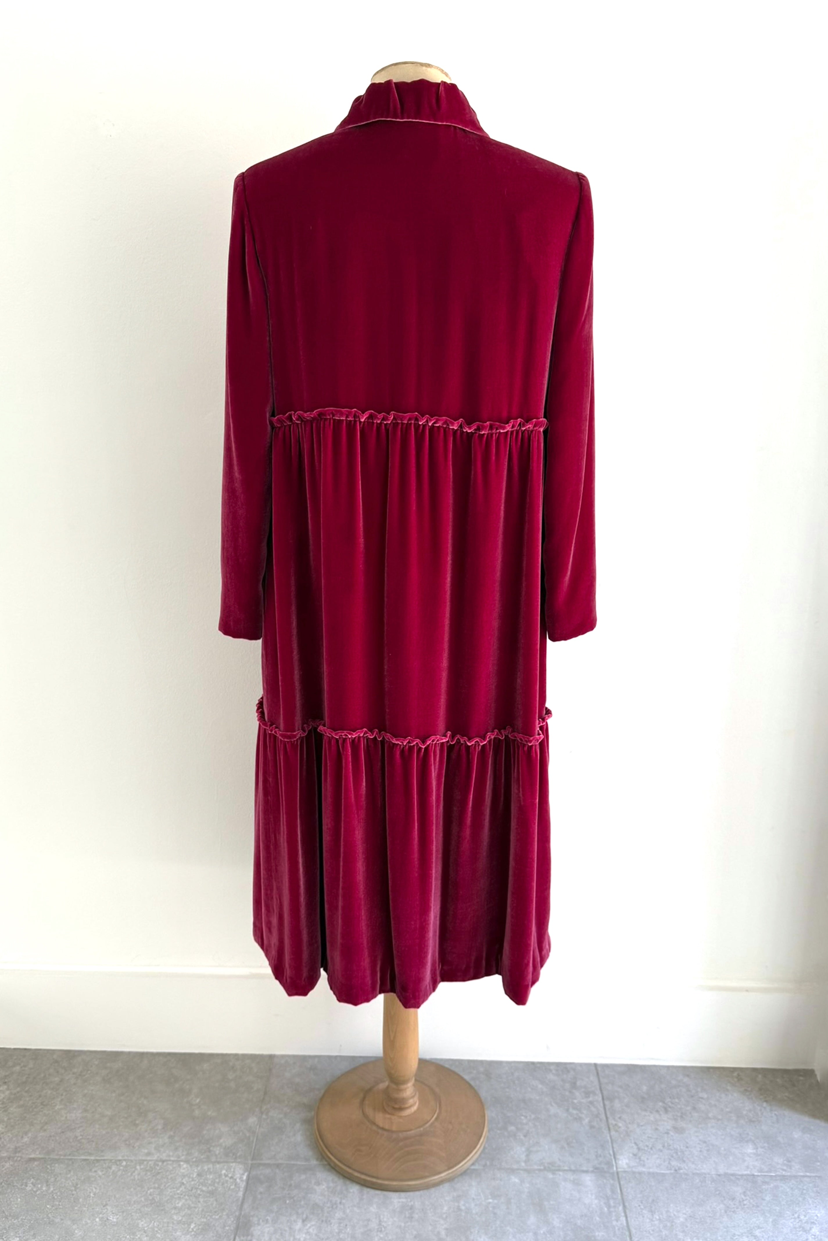 The tiered Rapunzel coat features a round, pleated collar, gathering detailing, full-length sleeves and oversized covered button fastenings on the centre-front. Cut from lightweight velvet, Rapunzel is ever so soft to touch, falling gently – almost water-like - off the shoulders. Lined in silk satin featuring the Eponine Fruit Dove Print.