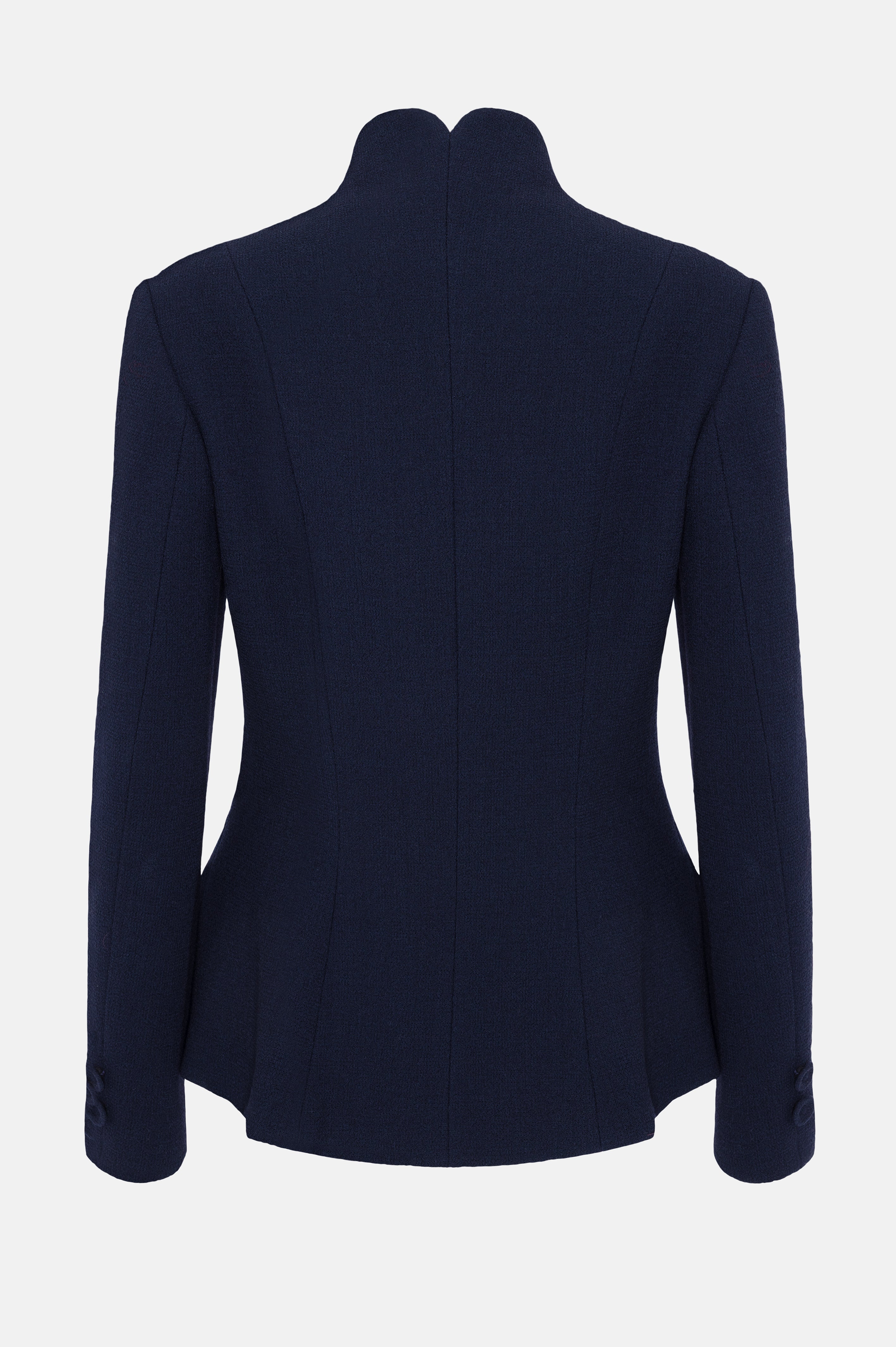 The fitted Blue Jay jacket features full length sleeves and concealed button fastenings at the centre-front. A high neck at the back graduates into a V-neck at the front, while the body-skimming cut falls to the base of the bodice.
