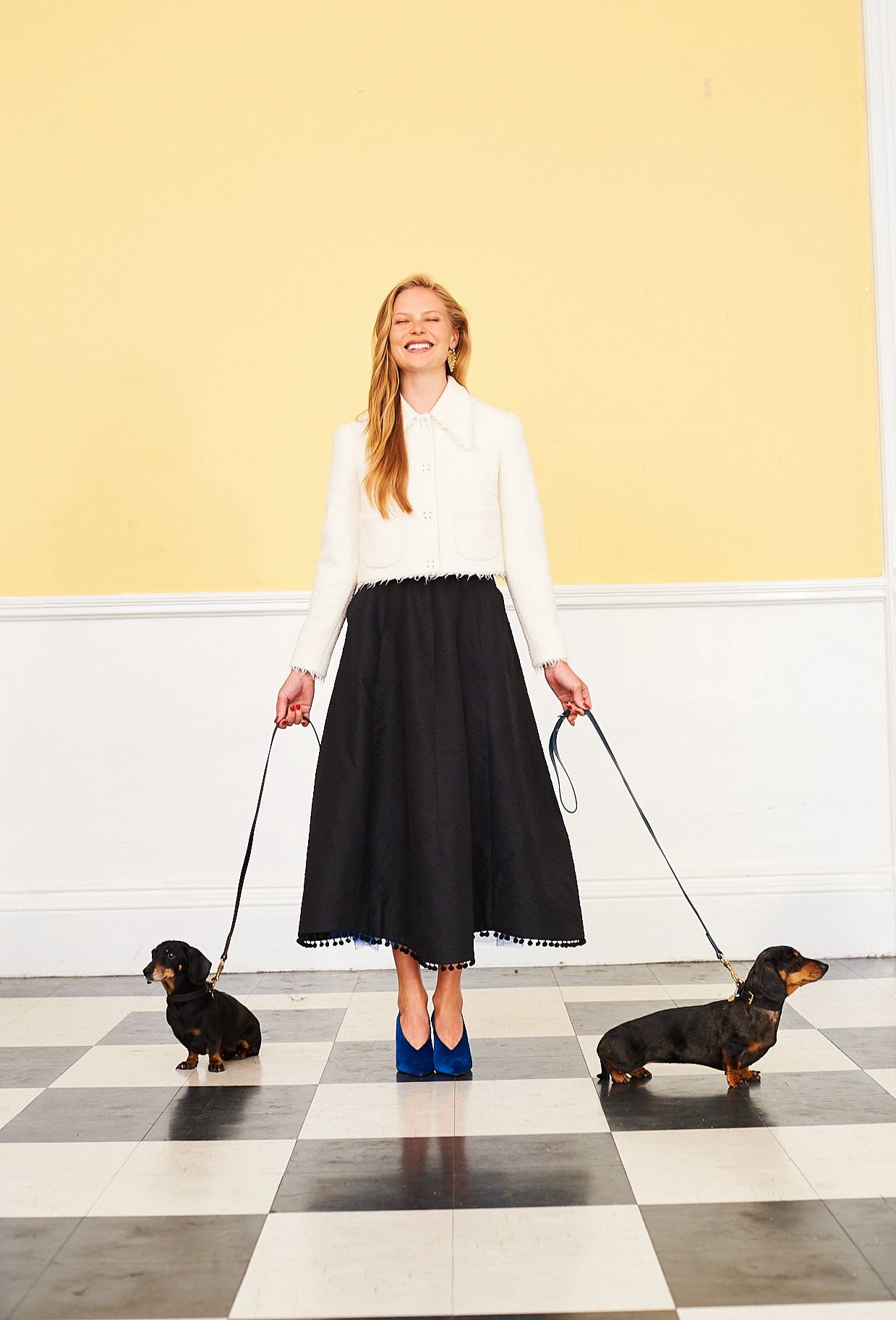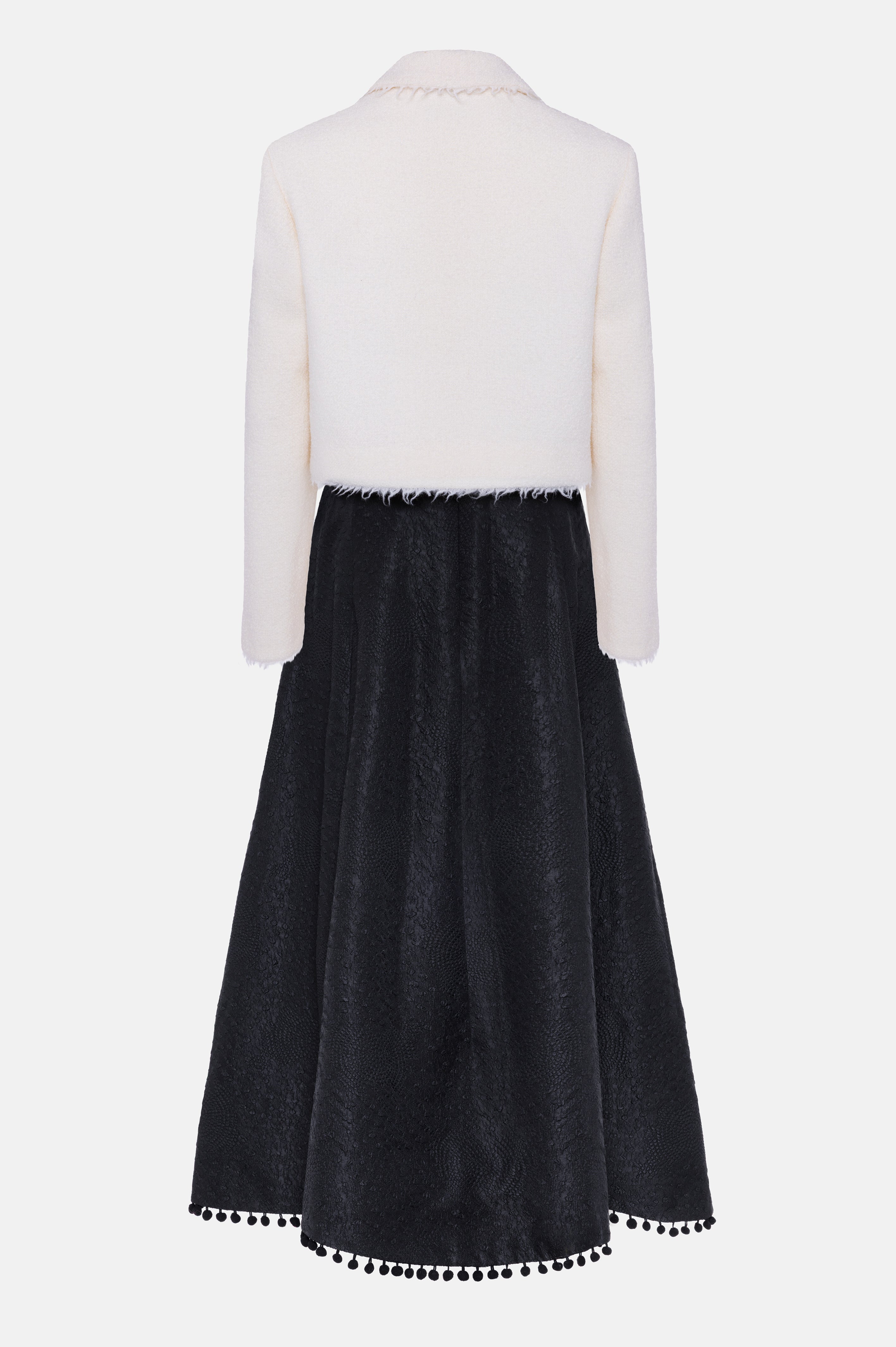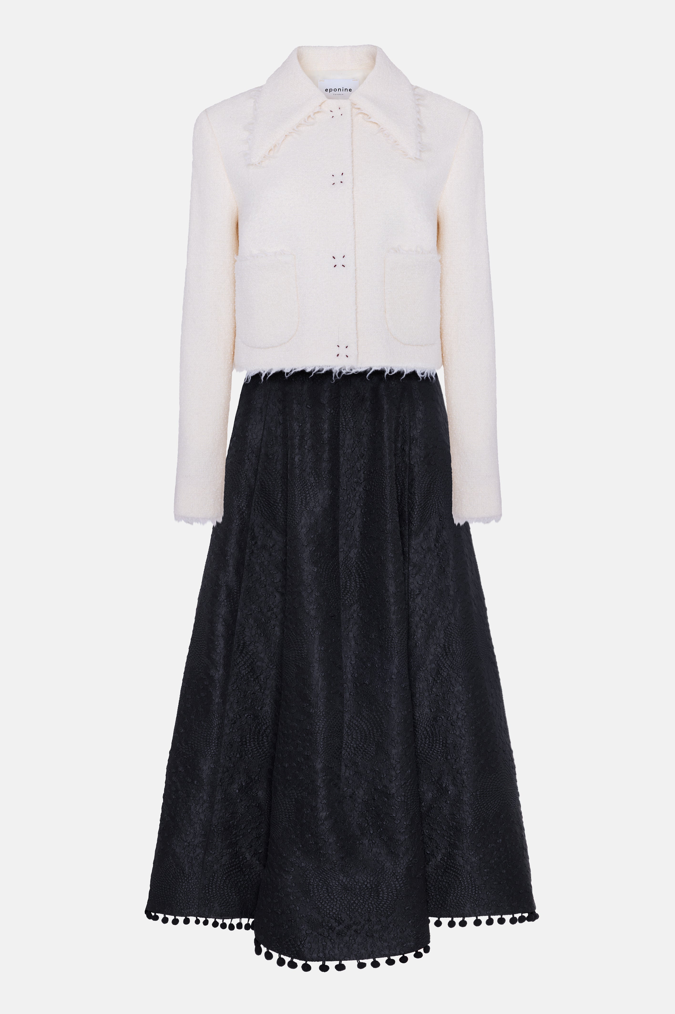 Ivory wool bouclé and black textured silk. Both designs are lined in silk satin.