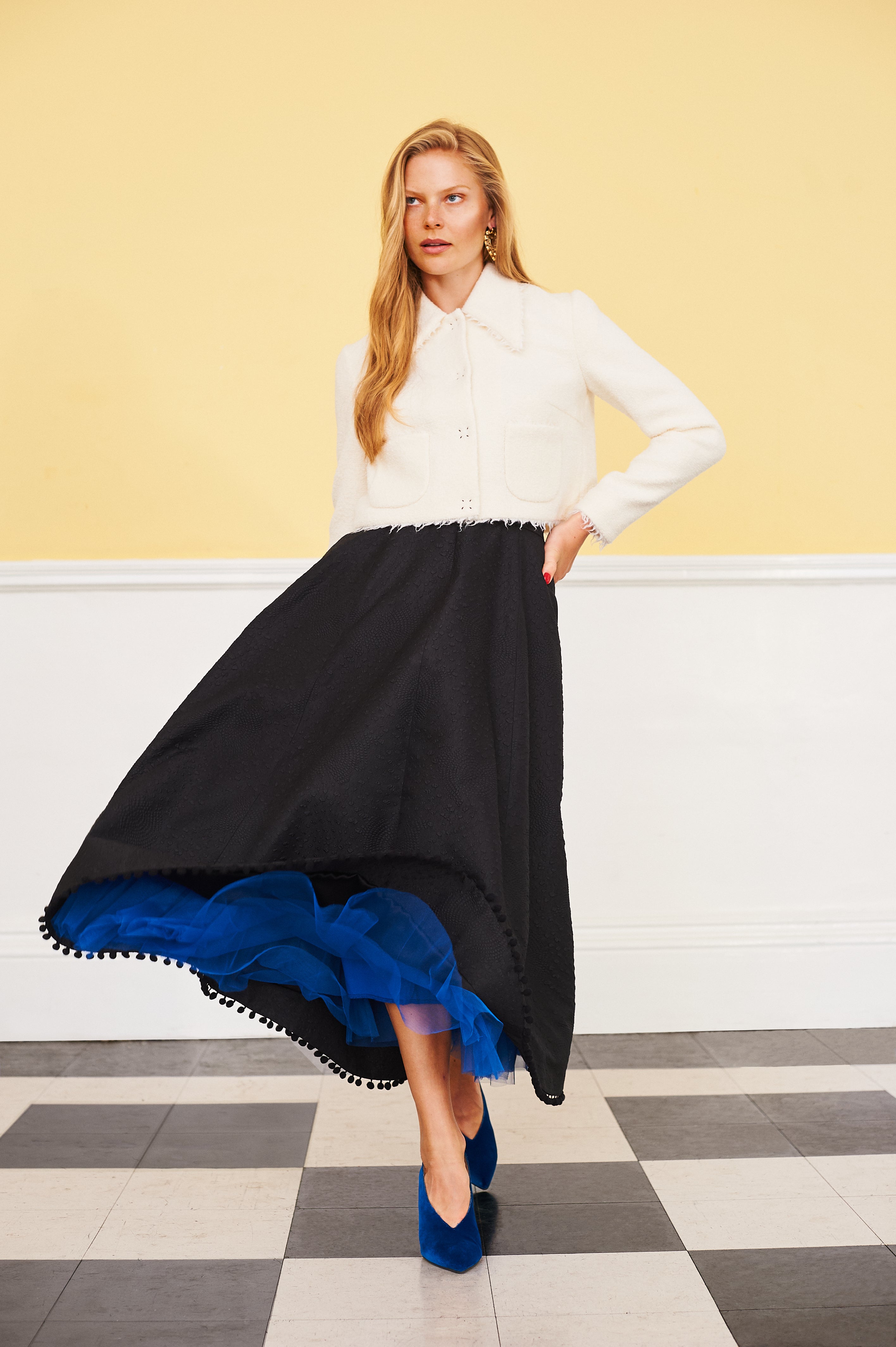 The Chickadee suit is quietly luxurious, embodying understated glamour while showcasing an exquisite monochrome look. The jacket is sharply tailored into a cropped silhouette with a playful oversized collar and a soft frayed-edge finish, whilst the skirt, is crafted from silk so light it seems to move on its own.